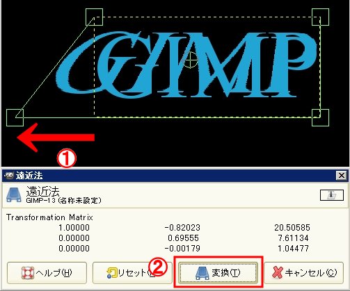 (遠近法)をクリック。続けて文字部分をクリックします。四隅に四角いマークが表示されるので左下の四角を左の方へ伸ばします。自分の気に入る所まで伸ばしたら「変換」をクリック。