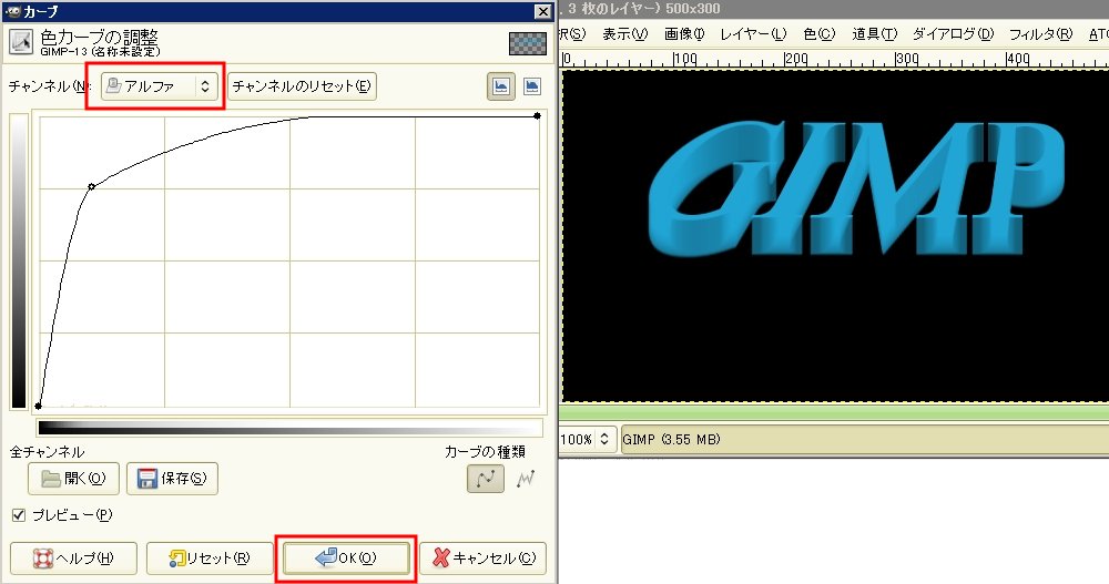 「色 → カーブ」をクリック。チャンネルを「アルファ」にします。マウスでドラッグして、下の画像のように直線を曲げてください。