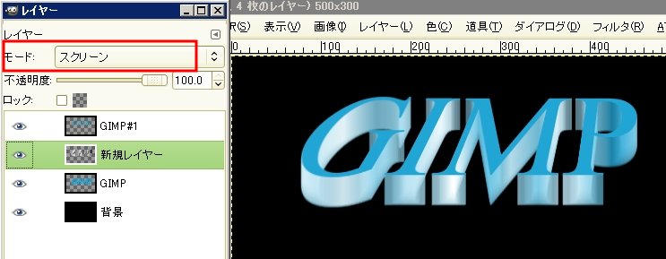 「選択 → None(Ctrl+Shift+A)」で選択を解除します。続けて、レイヤーダイアログでレイヤーのモードを「スクリーン」に変更します。