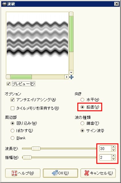 「フィルタ → 歪み → 波紋」で以下のように設定して「OK」クリック。