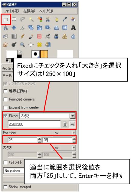 (矩形選択)をクリックして、道具箱の「Fixed」にチェックを入れ「大きさ」を選択します。サイズは「250×100」にします。