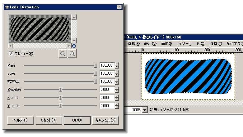 「フィルタ>歪み>Lense Distortion」で以下のように設定します。