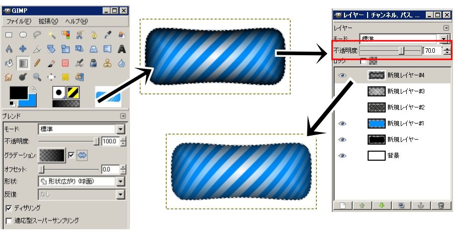 グラデーションをかけたら、レイヤーの不透明度を70に設定。