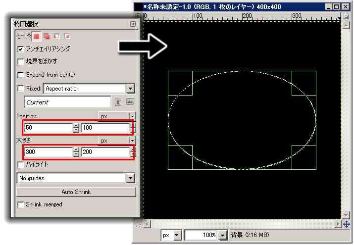 とりあえず、位置と大きさは後で指定するので適当に選択をかけます。