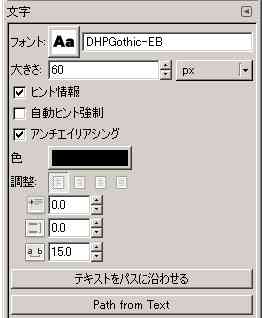 (テキスト)をクリック。さらに描画ウィンドウの適当なところをクリックして文字を打ち込みます。ここでは「GIMP」という文字を下の設定で打ち込みました。