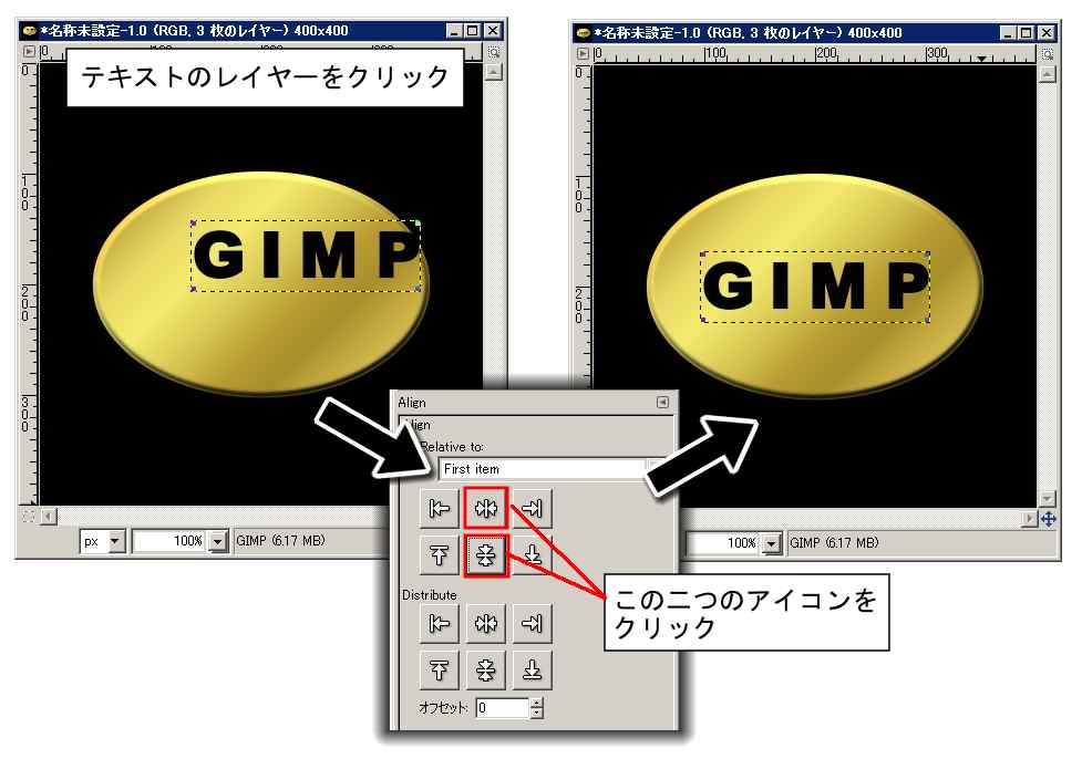 このテキストのレイヤーを以下の手順で中央に配置します。