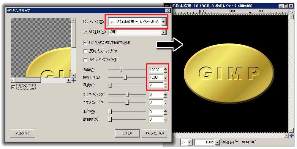 「フィルタ>マップ>バンプマップ」で、下の設定のように設定してバンプマップを適用します。