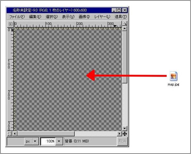 まず、使いたい地図の画像を用意します。その画像を描画ウィンドウにドラックし、このレイヤー名を「地図」とします。(画像はクリックで拡大します)