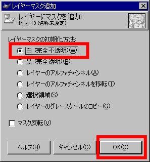 次に、「地図」レイヤーにレイヤーマスクを追加します。「レイヤー」の「マスク」にある「レイヤーマスクの追加」をクリック。その際、「白(完全不透明)」にチェックを入れます。