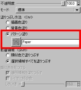 レイヤーマスクをテクスチャ「Paper」で塗りつぶします。この時、「塗りつぶし方法」で「パターン塗り」を選択し塗りつぶします。