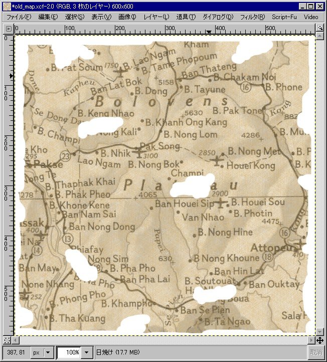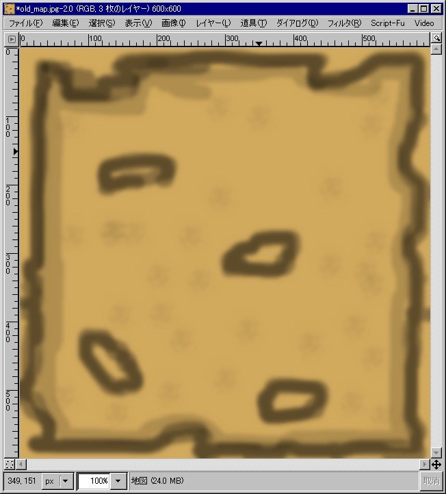 ということで、古風な地図の出来上がりです。冒頭で示したチュートリアルのものとは、見た目的に違いますが、まぁこれはこれで良いかと…。焼きこみ方をもっと工夫すれば、いい味が出てくるかもしれません。