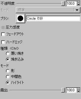「破れ」レイヤーで白く塗った部分のふちを焼きこんでいきます。このとき、重ねて焼きこんだり、露出の値を変えて焼きこんだり、モードを変えたり、ブラシを変えたりして焼きこみます。