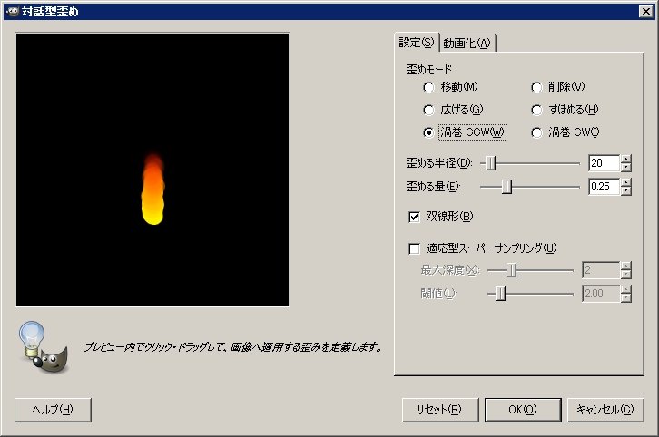 設定で「渦巻 CCW」にチェック。「歪める半径:10」「歪める量:0.25」に指定します。