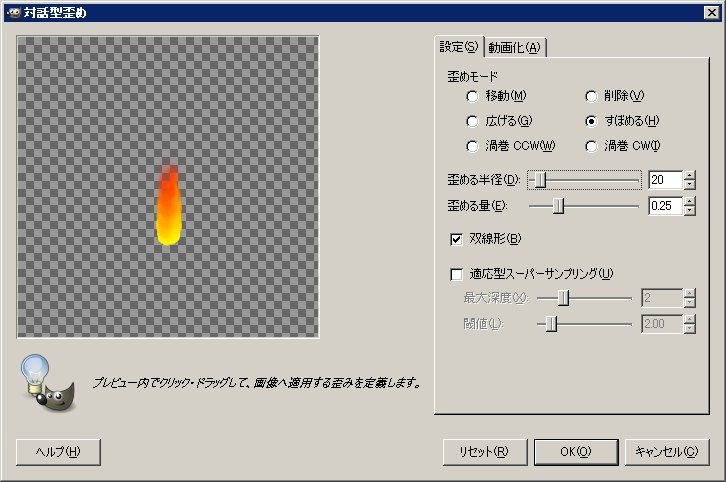 「すぼめる」にチェックを入れ、「歪める半径」を20に変更します。