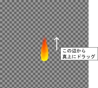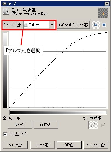 チャンネルで「アルファ」を選択し、表示されている直線を上図のようのドラッグして変形させると、作成した炎の形が変化します(プレビューにチェックを付けた状態)。